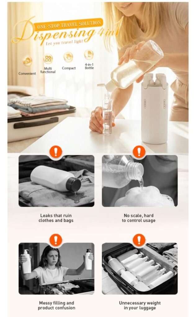 4 in 1 Travel Dispenser, 4 Pack 30ML Travel Bottles for Toiletries, Leak Proof Travel Size Containers, Portable Containers for Shampoo Lotion Conditioner Cream