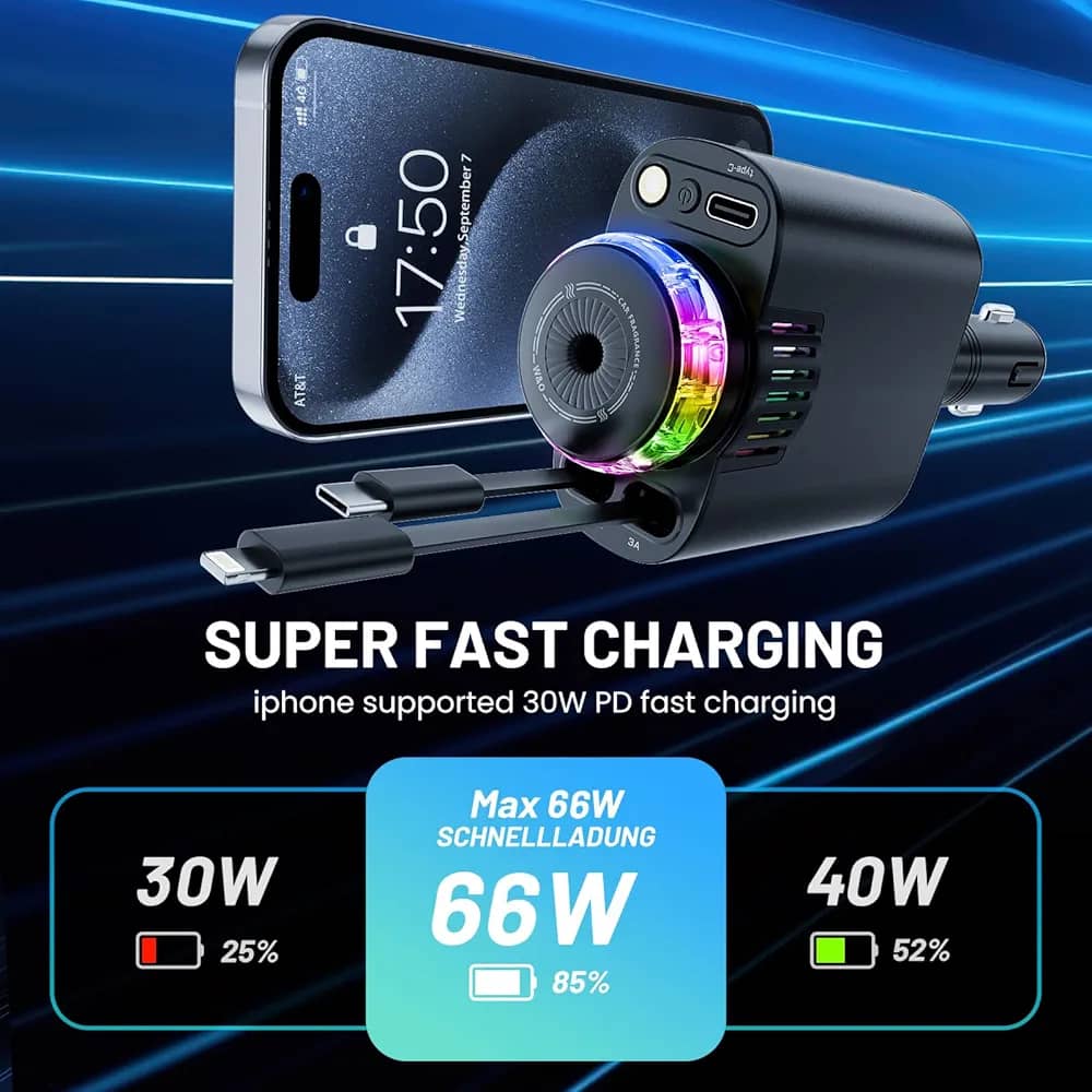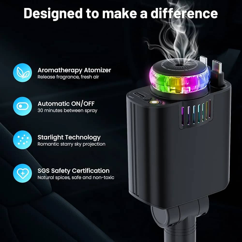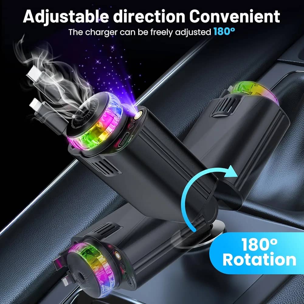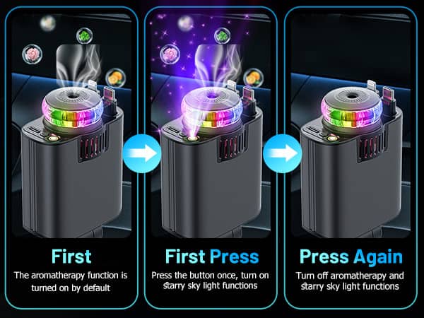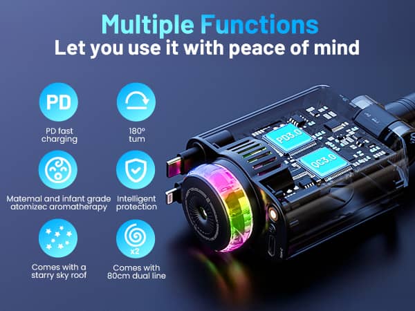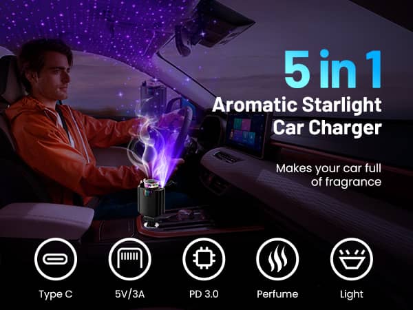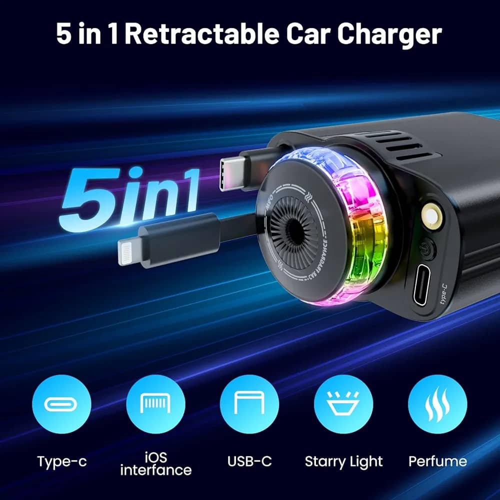 All-in-One Convenience: The 5 in 1 retractable car charger built-in two retractable cables(fit for IOS and Type-C)and a USB C port,let you charge three devices at once. Comes with soothing aromatherapy and star-top ambient light making your car rides more enjoyable and stress-free