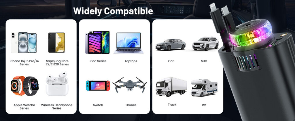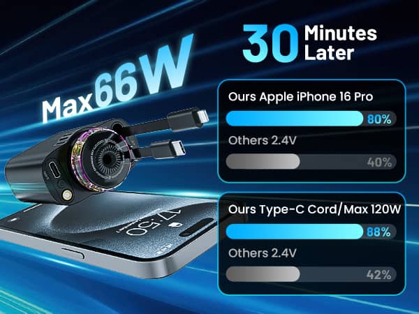 Space-Saving and Organized: The fast-charging car charger helps you keep your car’s interior tidy and organized with a convenient 31.5-inch retractable cable design. Extend and retract the cable with ease to eliminate tangled wires and maintain a clean space