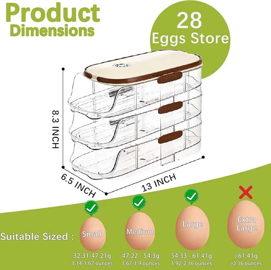 【Auto-Rolling Design】this egg holder uses gravity to handle egg retrieval automatically. When you need an egg, they simply roll right down to the front access opening. it guarantees you use the oldest eggs first , egg storage for refrigerator eliminates the hassle of rummaging through a pile of eggs entirely. Whether you’re scrambling to get breakfast ready on a busy morning who struggles to handle clunky egg cartons. Note: Do not stack eggs on top of each other, as they may break.