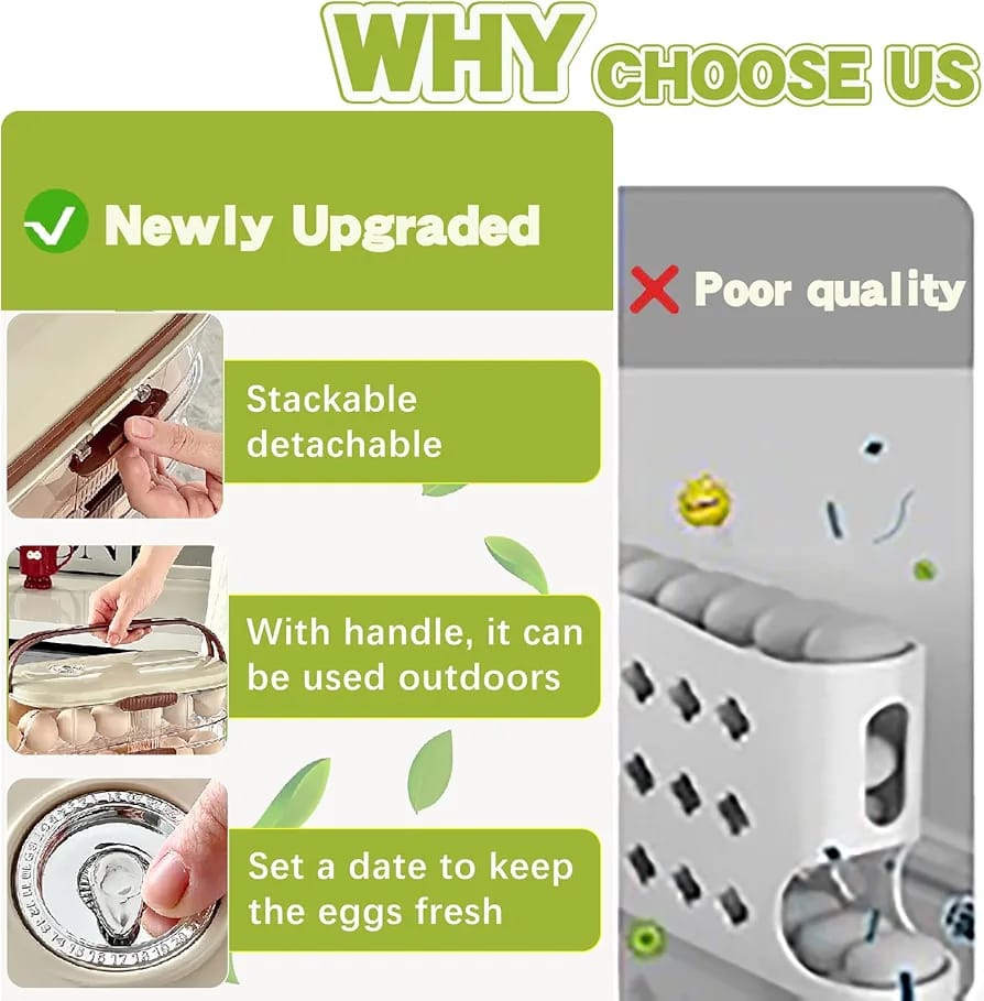 - 【Built-in Handle, Lid】Unlike bulky and hard-to-grip egg container for refrigerator ,this egg tray for refrigerator features a sturdy integrated handle on top. The handle is ergonomically designed for a comfortable grip, making it easy to carry. The lid uses a gentle snap design to prevent dust, debris, and odors from the refrigerator from entering.